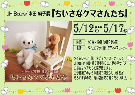 砂糖菓子の様な小さく可愛らしいベアちゃんを作られる「JH Bears/本田 純子」様の 展示会を開催致します♪ 期間:2016年5月12日(木)~5月17日(火) タイトル:「ちいさなクマさんたち」 場所:タイムロマン 1階ショップ テディベア企画展コーナー 時間:10時~19時 (水曜日定休)  初日は店頭販売のみ。オープン時、お客様多数・ 重複の場合は抽選とさせていただきます。(10時半締切) 2日目よりネット・お電話でも受け付け致します。 本田 純子様の作品が沢山揃う貴重な機会です。 是非、小さなクマさん達に会いにいらしてください。
